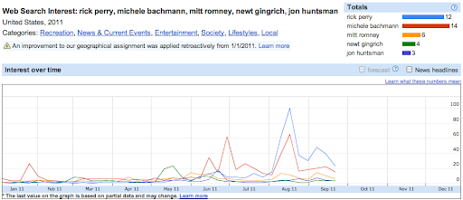 more people are searching for [Michelle Bachmann] that are searching for Congressman [Ron Paul], Governor [Mitt Romney], Speaker [Newt Gingrich] and Ambassador [Jon Huntsman].